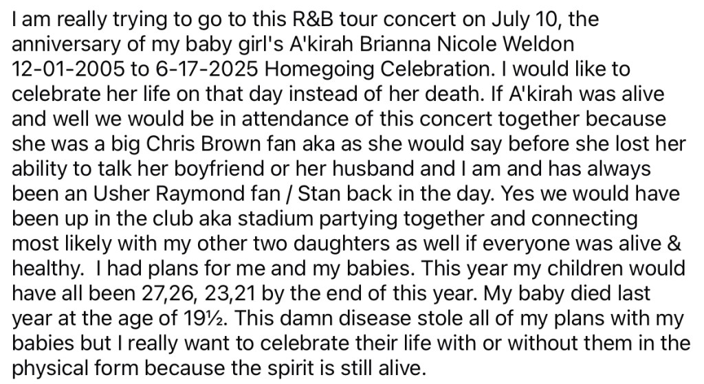 I am to look at Anajee’ and tell her to sit herself down somewhere get out the mirror, I want to be at the cheerleading practices and competition and the dance rehearsals and events I want the sport activities because I know that A’kirah would have played basketball because he big sister did and she would have played volleyball because the other sister was doing that. I want the regular worries that parents have. I am missing my daughters, I am wishing for the life I did get to experience with my children. I woke up today and made a mistake I lived in my past and thought about the future instead of doing what keeps me together and that’s living in the moment and now I am hurt and sad with wishful thinking smh! When Anajee’ turned 8 years old she became bed ridden. Akirah became bed ridden right before her 12th birthday.