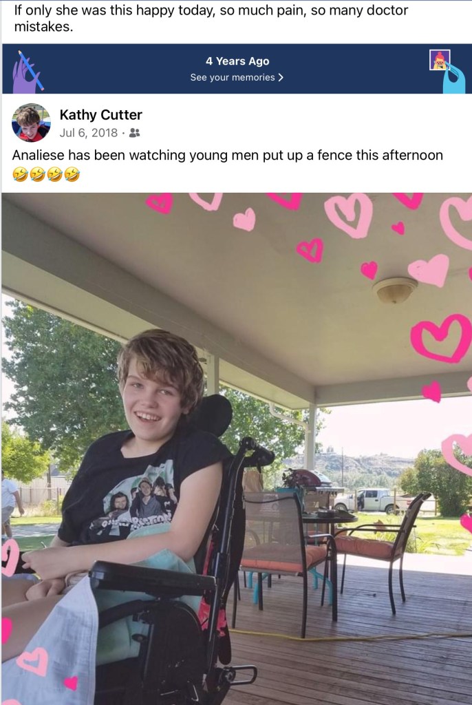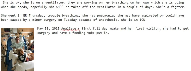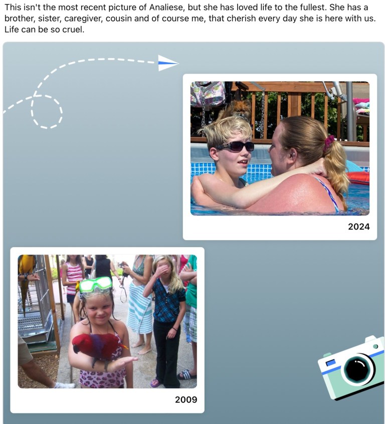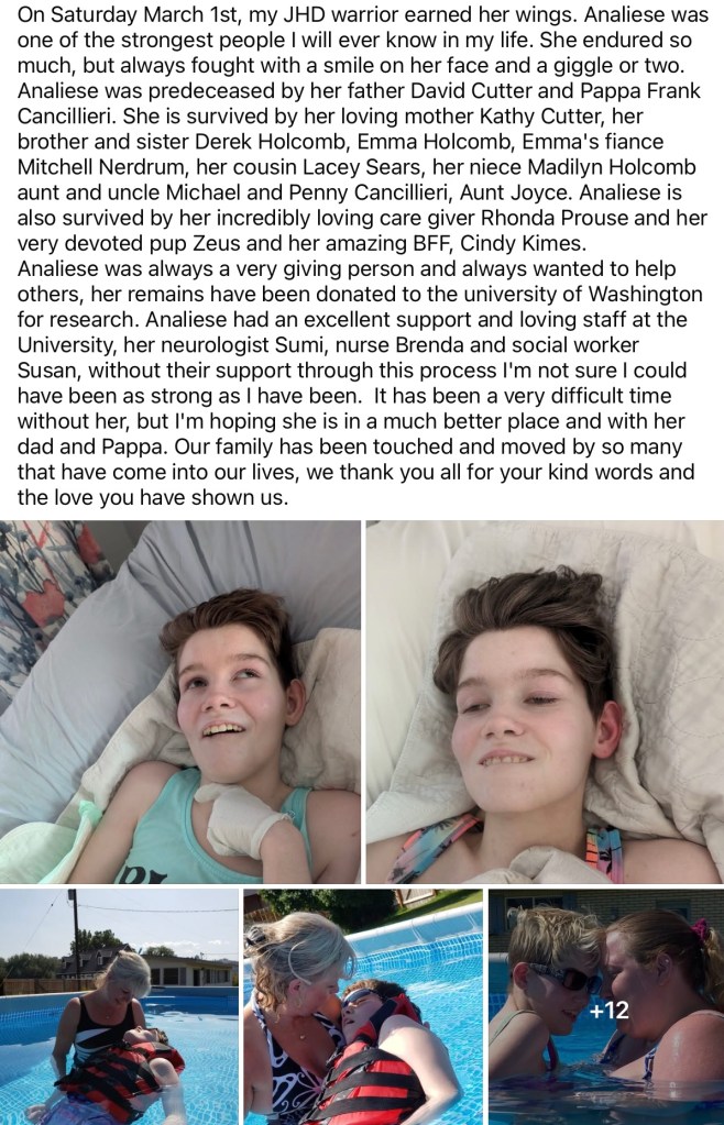She was always a talker, and she had to be given a talk time out, but that never stopped her, she would talk anyone’s ear off, she had so much to offer, well she believed so. Even with her daily struggles, the inability to walk and talk any longer she always had a smile. She was an extremely special little girl. Loved by so so many, and so many that she had touched. My moto, especially with this disease now is, you can’t change the past, you can’t predict the future, live for today and try to make it a great one.