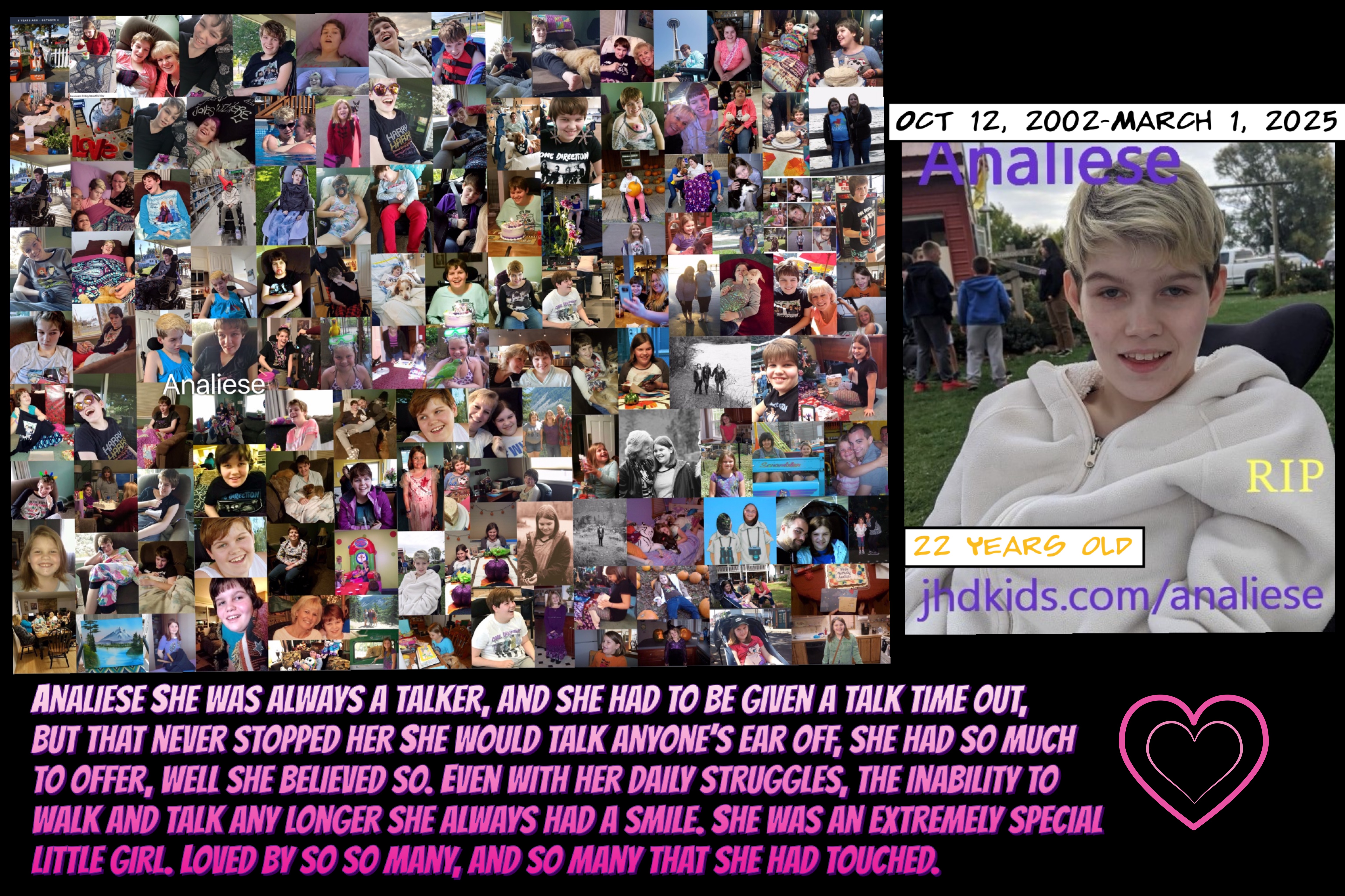 She was born on Oct 12, 2002-March 1, 2025. Her favorite color was purple, her favorite band was One Direction, mainly Harry Styles. She was able to attend their last concert in Seattle before the band split, was one of the best nights for her. She has had a lot of struggles in her short life, but she always smiled. She was a very giving little girl who was always there to help the kids in her kindergarten class that could not speak, she invited them to her birthday parties and they were always her focus, making sure they enjoyed themselves. She became a strong swimmer, swimming laps around me, worked very hard with her instructor and was very sad when she could no longer swim. She always wanted to play outside even when it was 20 degrees out and a colder wind chill, when we lived in New York.