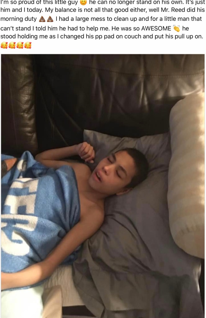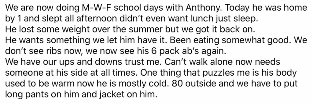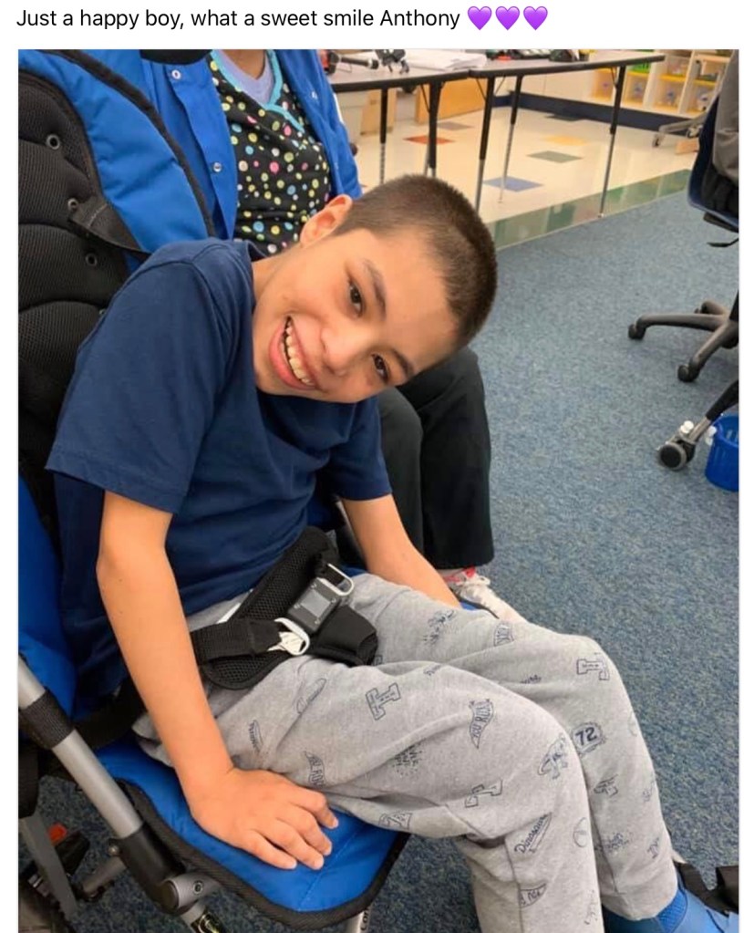 The school Anthony went to is for only special needs children been good for him. But he had been picking up bad habits that he never did before. He is non-verbal but if we asked him to tell us about his day, he would anthony (59)just babble and babble telling you all about his day. He really tried to talk. He was doing real well with baby sign language but like any child that has Asthma or ADD if they don’t want to do something they are not going to do it. That how he was “STUBBORN” but a lover. This was our boy every day of his life  and didn’t get any better. It really really sucked to see him go through this. Had to tell him head up all the time. He picked it up and down it goes no strength at all in his neck.