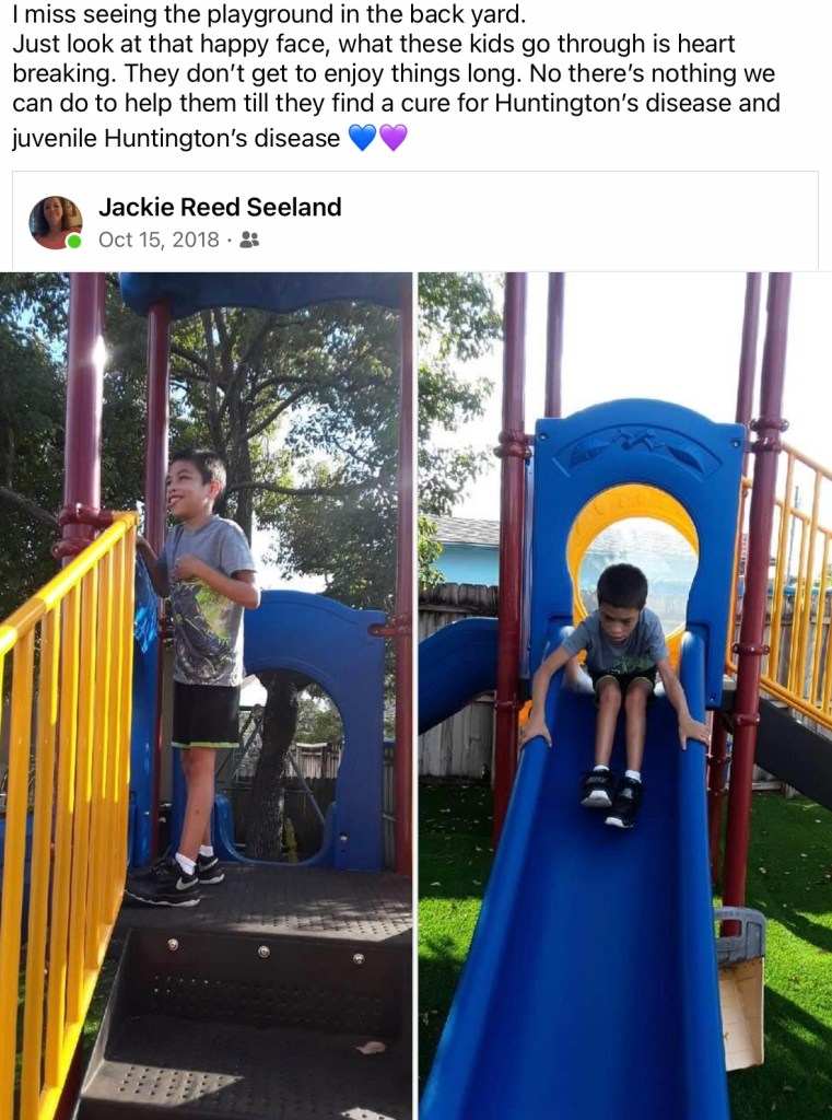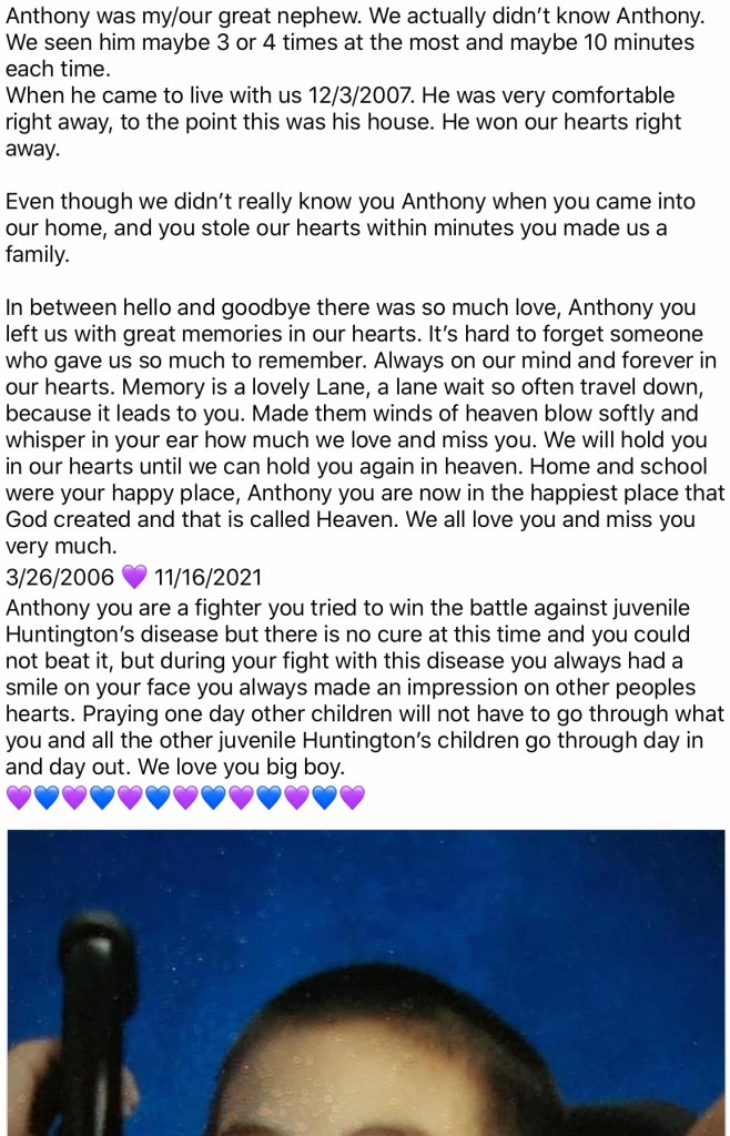 anthony (1)Anthony was non verbal, developmental delayed, autism, tuberous sclerosis, seizure disorder, dystonia and his JHD repeats 86. His Dad had HD and lived in the nursing home.