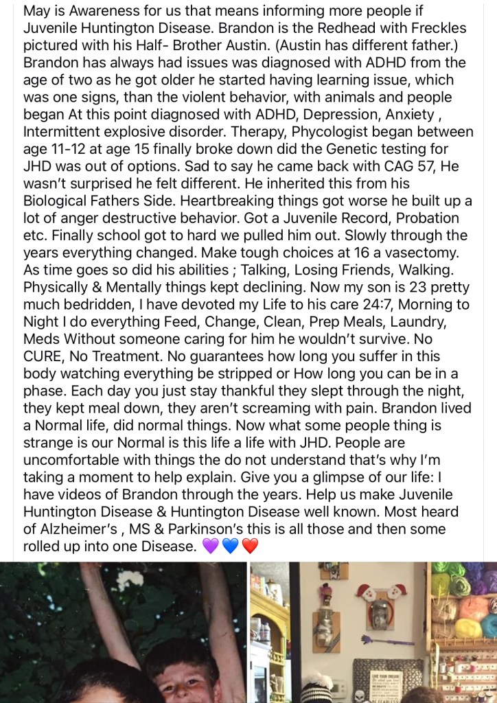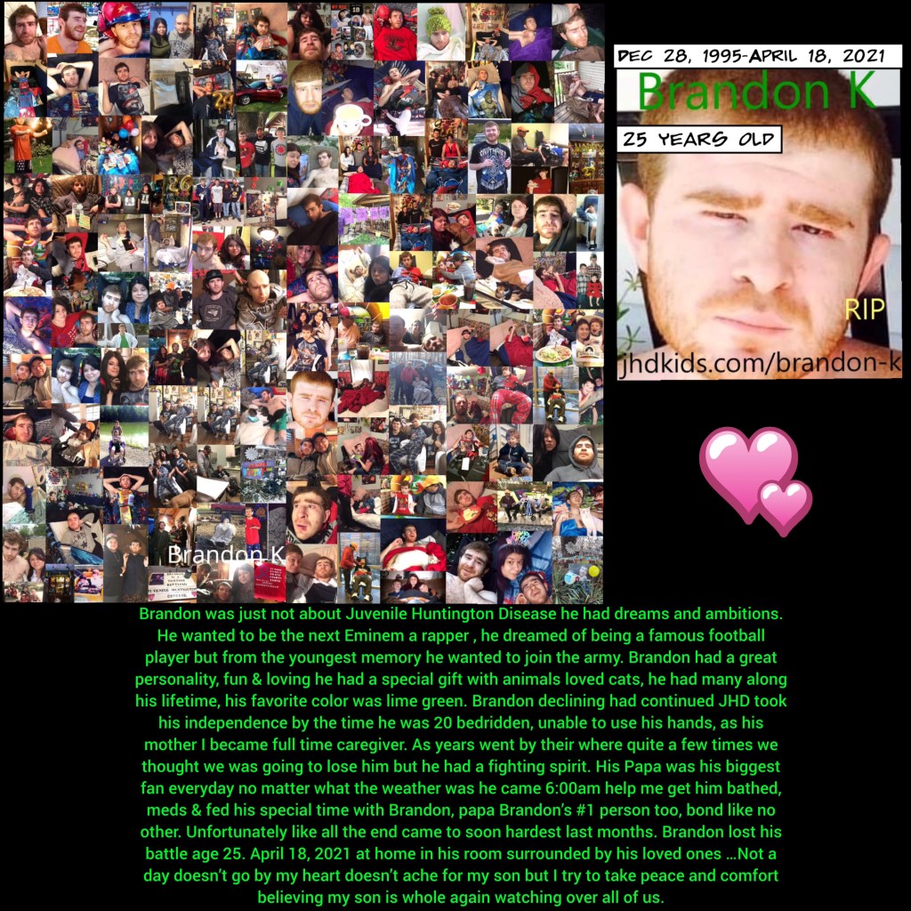 Brandon was 18 soon to be 19 next month. I just legally got guardian ship over him, hard choice to make but I wanted best for him. I did what I needed to make that happen. He had stop and started taking his medicine for the last two year. Last year he had been consistent on taking them, ya he’s skipped a few, we also have increased them a few time. This has been beyond an easy road, and still it was not be an easy one as we kept traveling down the path of JHD, but we never let JHD take over my sons life he always had control the best he could… This is just a small summary of Brandon’s story, awareness is everything we will never give up hope for a CURE.