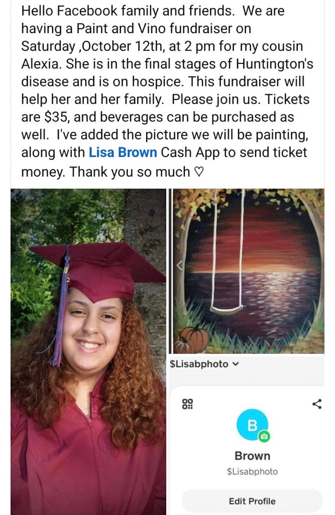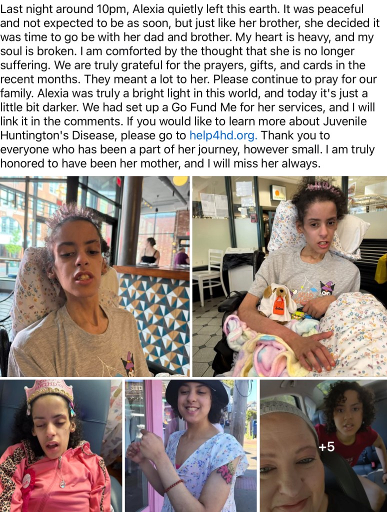 In January 2018, Alexia (Cameron’s twin) was diagnosed with JHD. She was 16, my heart is broken , I’m having such a hard time just writing this as if writing it will make it truer. Her CAG is 69 and among many other symptoms (mostly mental) she had started having focal seizures. This scared me for obvious reasons but also because Alexia was born intellectually disabled. So I was so scared that would be a factor in how quickly she lost skills. I cant believe I am here again.. She had a 24 hour eeg.