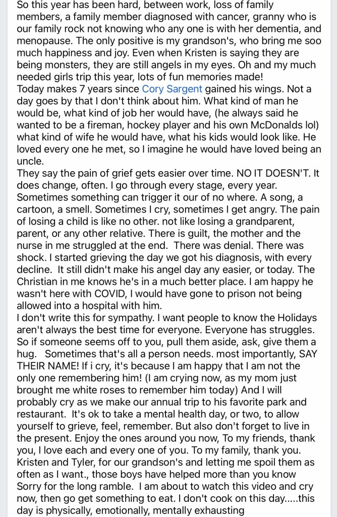 He once hugged a complete stranger! we were at the grocery store checking out, and you could tell the clerk was having a bad day. he had asked for candy, he hardly ever asked for anything, so of course i said yes. I don’t think I have ever told him NO! lol So he watched for her to scan his candy, then walked around to give her a hug, niether of us saw him, i just heard a sound of shock and her jump! She stopped what she was doing and gave him a hug, when she stood, she told the other customers sorry, but she needed that hug, and she was holding back tears. After that, every time she saw Cory, she had to get her hugz!’ He loves motorcycles. He left us so many amazing memories. Feb 16, 1994-Dec 12, 2015.