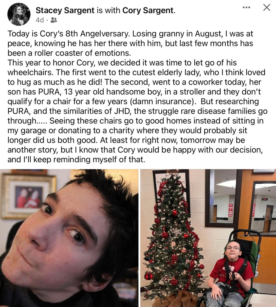Stacey (Cory 21)- well…..it’s sad that since the discovery of the gene, that our countries high divorce rate, that blood tests that used to be required for marriage checked for venereal disease and not genetic disease it’s also sad that these kids have to miss out on so many things-driving a car, dating, friendships BUT, I do believe they (JHDers) are angels here on earth, and each have a purpose to fulfill in their short lives.