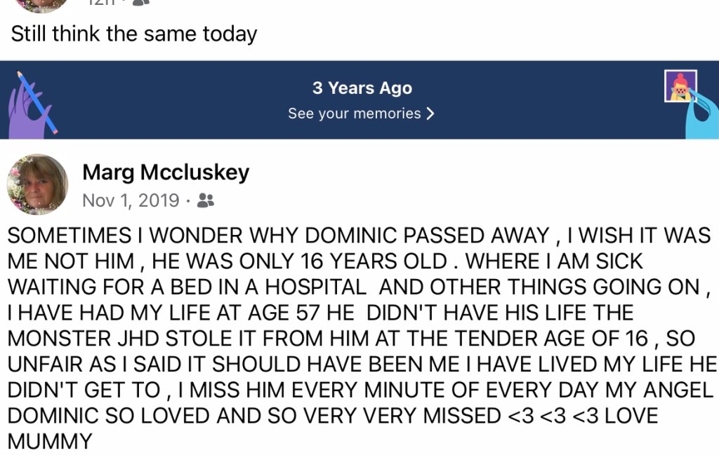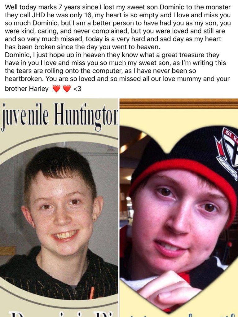 Dominic got sick at a very young age no could think he had jhd i went to dr after dr it took 4 years to get him tested as no one wanted to do it thats the way it is in Australia and because Dominic was adopted , then at age 11 he was tested he was given 2 to 3 years then thats what they told me , Dominic has well passed that at age 15 . but when he was little everyone said its adhd etc etc but i knew it was jhd but no one would listen , Dominic is my life i love him so very much , Dominic before he was tested would hit me throw stuff around go into like trance like states then after awhile he would be fine.