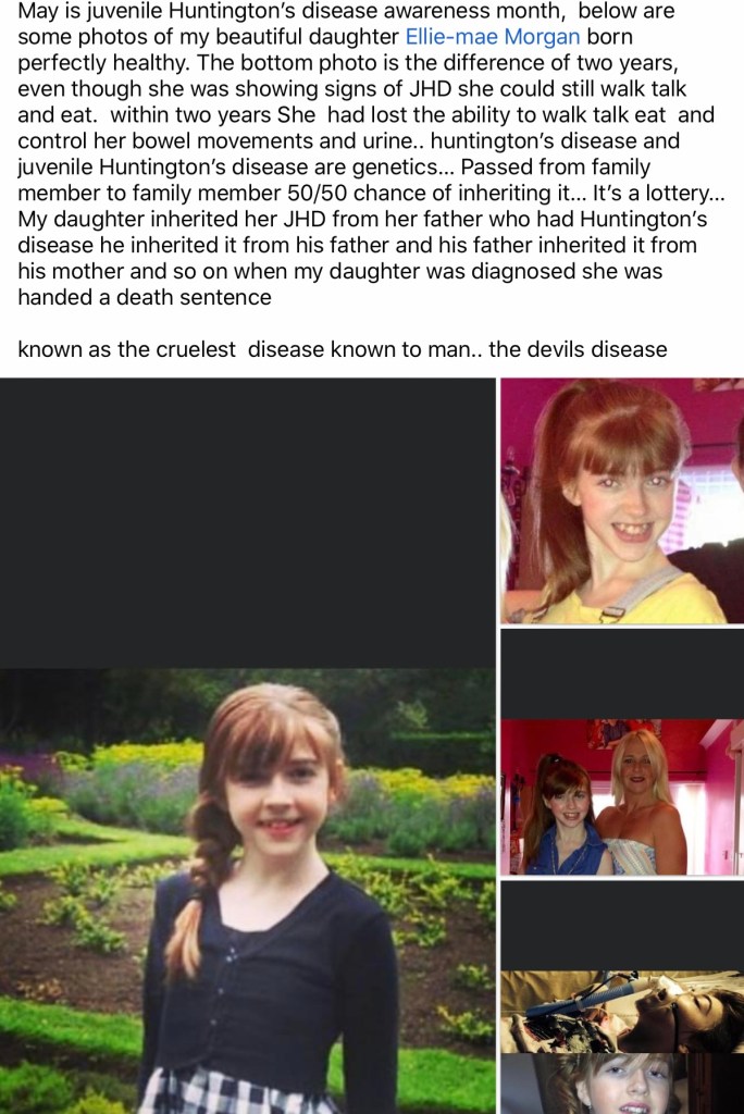 Ellie inherited the rogue gene from her father. Ellie-Mae was out going lively social butterfly now her body wracked with spasms cause her to scream out, can’t walk talk, double incontinent,16, bravely fought rare genetic condition more than two years with dignity an infectious smile won over everyone. She passed away surrounded by loving family early yesterday morning. Grief-stricken parents Sam and Richard Carter Facebook: “Goodnight god bless Ellie-Mae Morgan our brave warrior your free to walk again”. Countless tributes from devastated friends and even