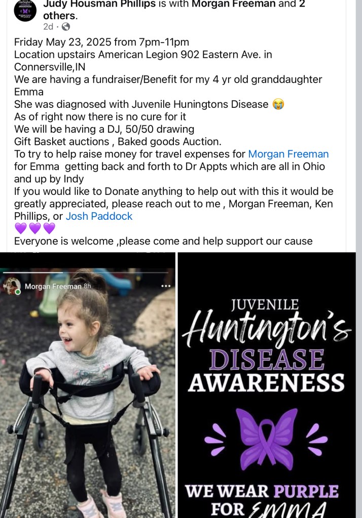 Hi, my name is Morgan and my daughter Emma has a rare genetic disorder called Juvenile Huntington’s Disease (JHD) is a rare inherited neurological disorder. She got diagnosed earlier this year at the age of 4 and unfortunately she has the highest count of CAG repeats her neuro doctor has ever seen 170. The symptoms are coming on quickly. On top of having this disease she also has Ataxia. This Ataxia is a neurological sign consisting of a lack of voluntary muscle coordination, resulting in uncoordinated movements, balance issues, and problems with gait, speech, and eye movements. As we’re facing daily battles unfortunately she needs adaptive equipment to help her with her ADLS.