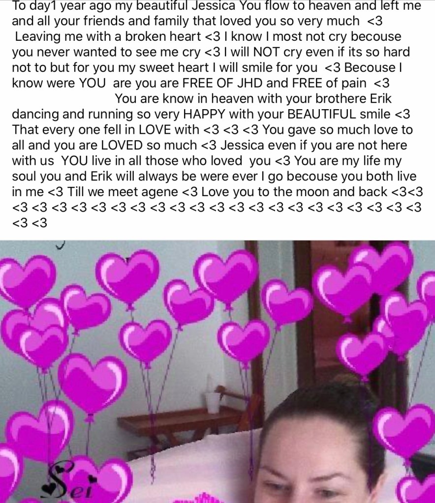 As you all know, Jessica was and still is my world and my life, and now I feel as if my heart is broken in a thousand pieces. But I know she is in Heaven and finally free from JHD.