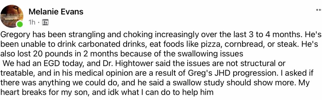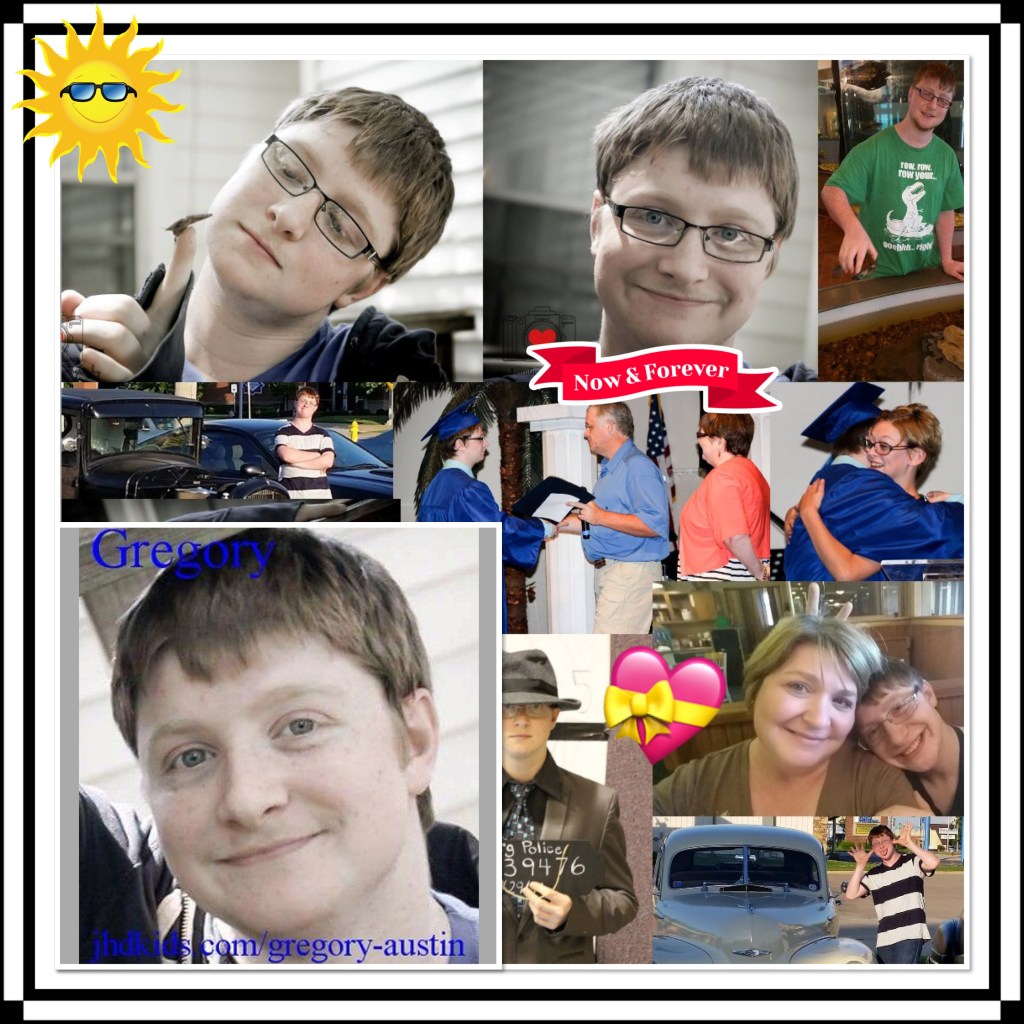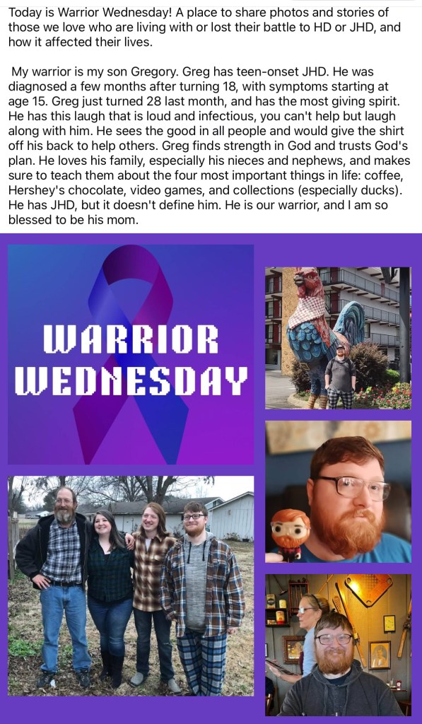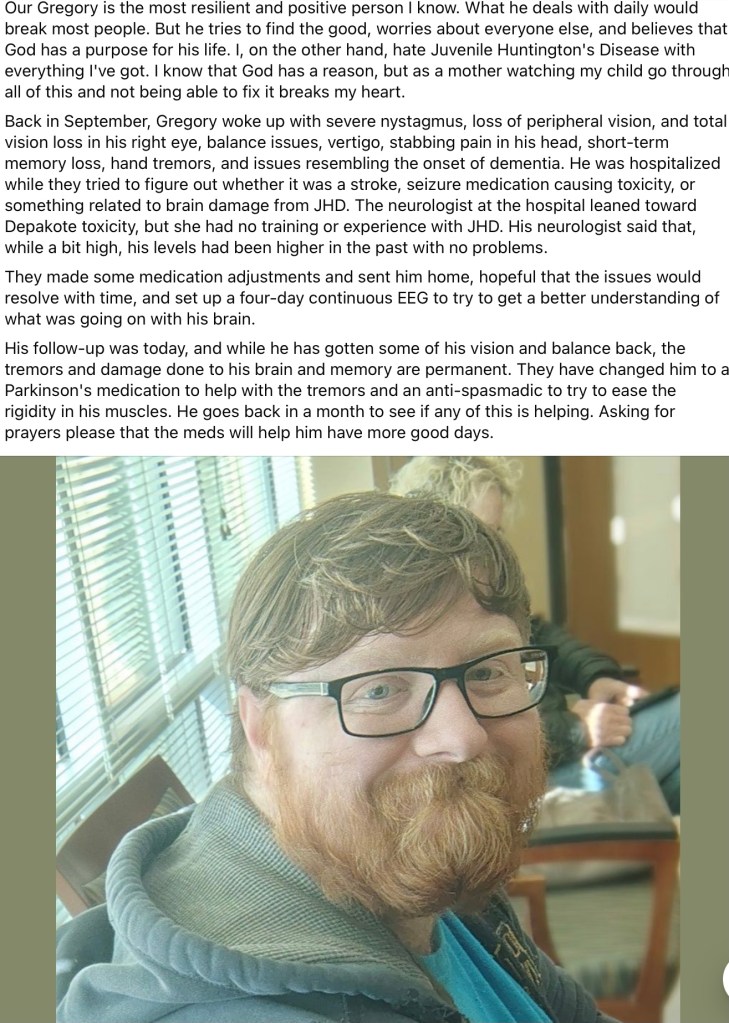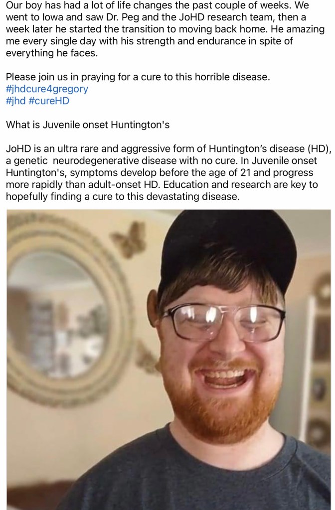 Gregory was born on April 29th, 1997. He presented at age 15. He started having impulse control issues, and started hearing and seeing things. He was diagnosed with bipolar and schizoaffective disorder. We now know that was a misdiagnosis and it was onset of JHD, Meds are helping him manage those issues. He has also got pain in his ankles and legs, and his arms and hands alot. He also started working about a month ago at McDonald’s here in our town. He wants to work as long as he can. He recently got engaged.