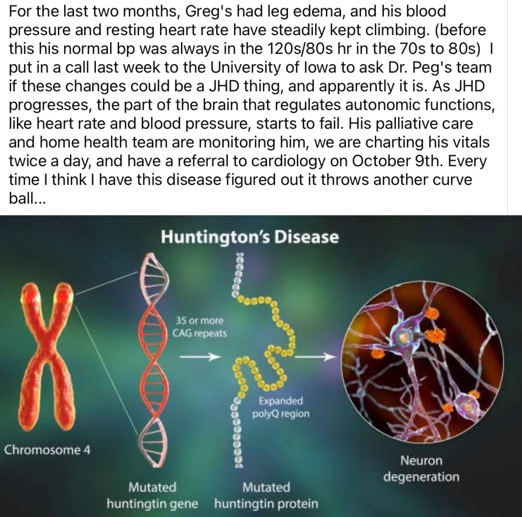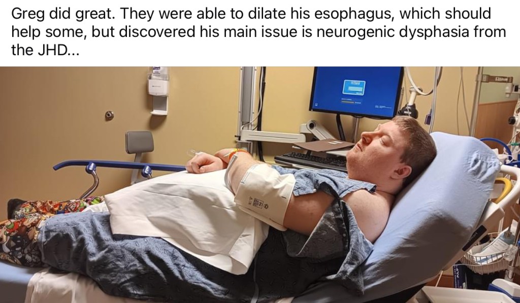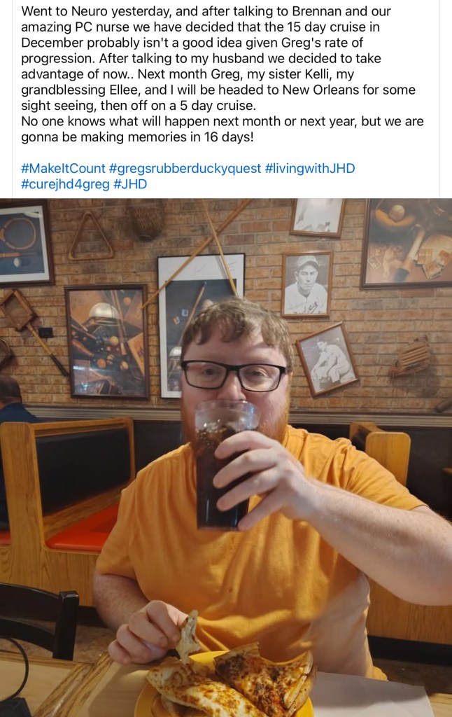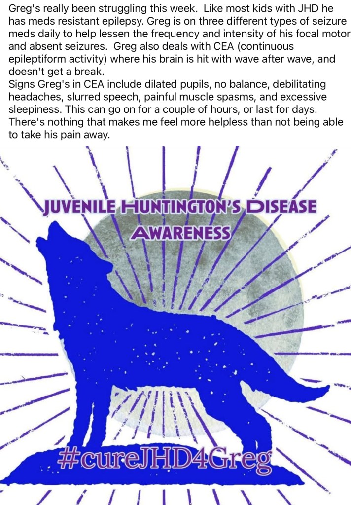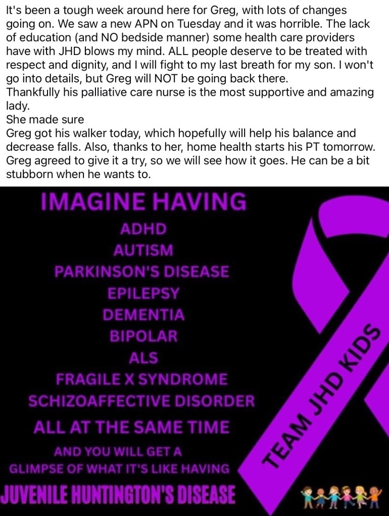 Gregory was born on April 29th, 1997. He presented at age 15. He started having impulse control issues, and started hearing and seeing things. He was diagnosed with bipolar and schizoaffective disorder. We now know that was a misdiagnosis and it was onset of JHD, Meds are helping him manage those issues. He has also got pain in his ankles and legs, and his arms and hands alot. He also started working about a month ago at McDonald’s here in our town. He wants to work as long as he can. He recently got engaged.