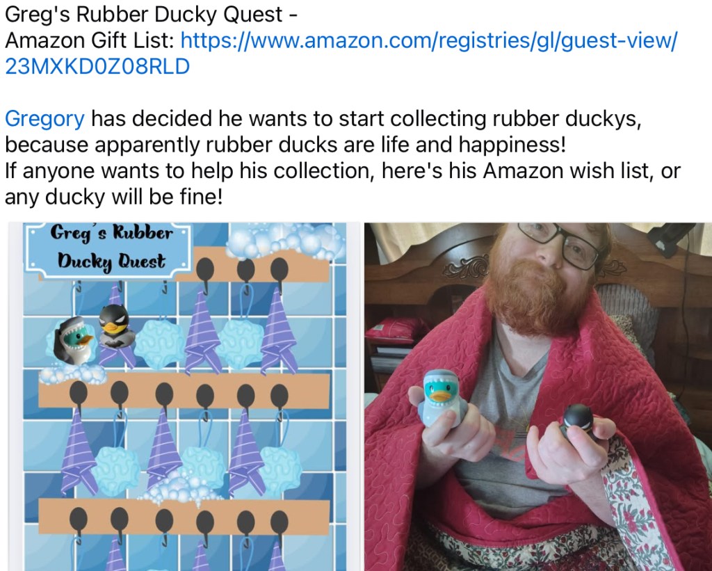 His favorite color is Blue. He’s really funny. He sees the good in people. He loves God and never gives up no matter how hard life gets. He has 2 sisters and a brother Loves Legos, his PS3, and is a movie nerd. He loves Rubber Ducks they bring him joy!! His page of journeying to get the ducks Greg’s Rubber Ducky QuestÂ