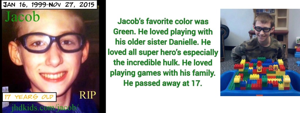 Jacob bravely fought through juvenile huntington’s disease. He is now an Angel in Heaven. January 16, 1999-November 27, 2015.