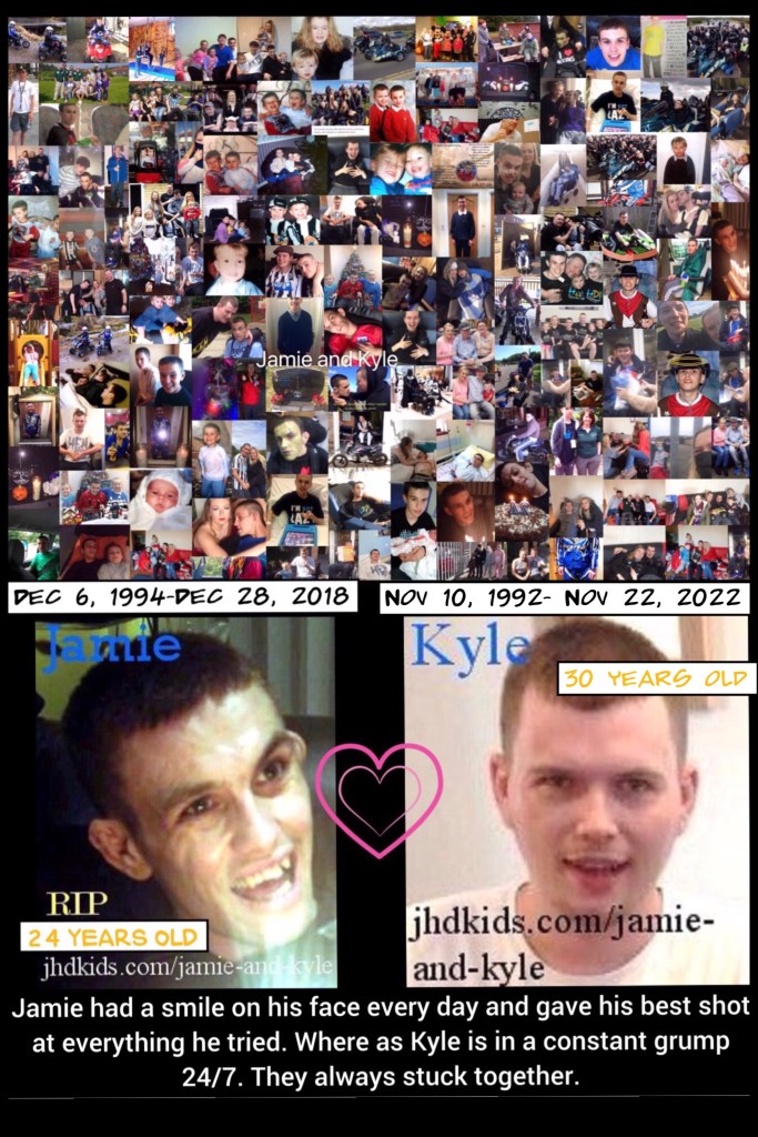 I’ve been with my husband mark for 14 years now, although he is not the boys genetic father he is the only dad that has ever been there for them and brought them up. We also have 3 daughters together Anastasia, Imogen, and trinity.Both boys were taking the diagnosis very differently. Jamie had a smile on his face every day and gave his best shot at everything he tried. Where as Kyle was in a constant grump 24/7. I was dreading what the future holds. I love all my children and it pains me to think what this awful disease was doing to my two sons.. My love goes out to you and your family. X RIP Jamie Dec 6, 1994-Dec 28, 2018. RIP Kyle Nov 10, 1992- Nov 22, 2022