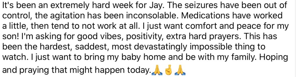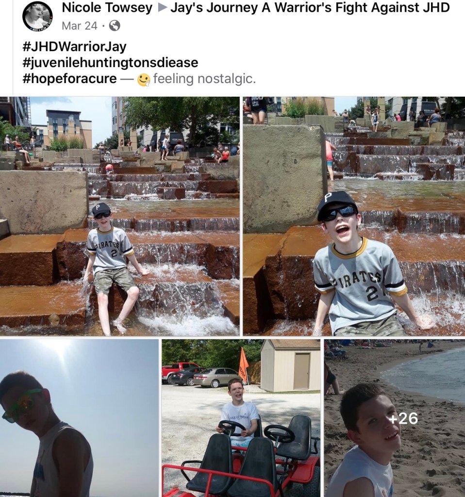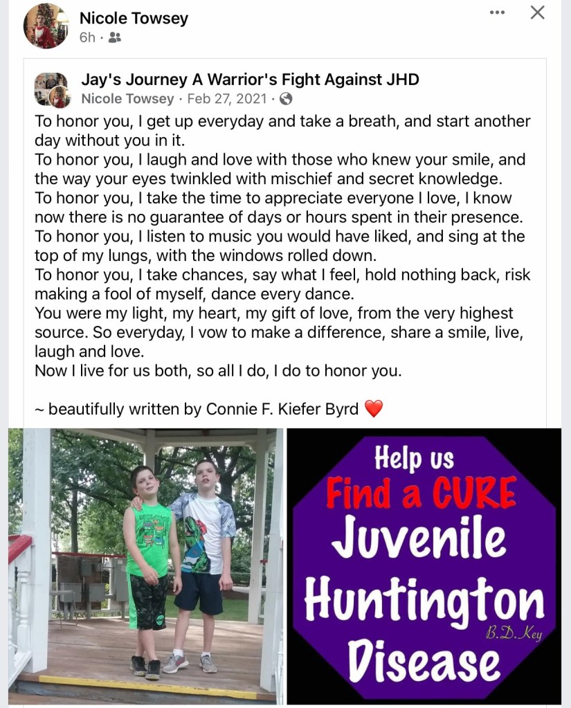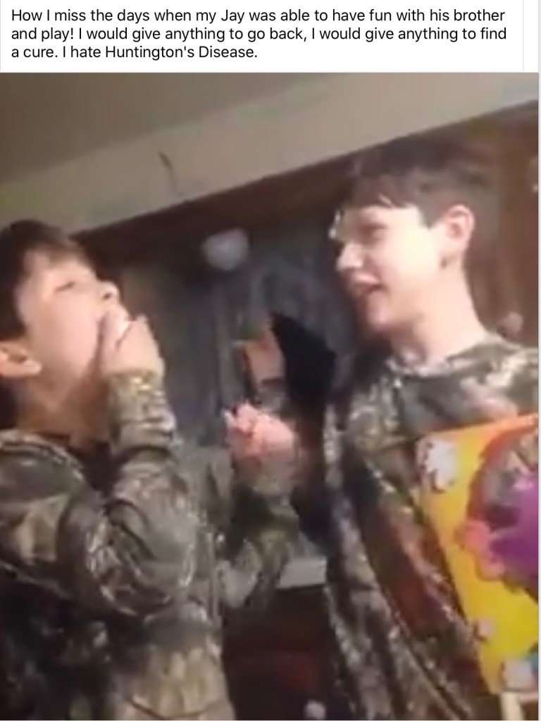Strongest and Bravest kid I know! My Warrior when he should have just be a kid. When I feel like I just cant do it I look at him and know if he can go threw the worst of it then I must be right by his side. Jay smiled and laughed every day. Its unimaginable to see your child thriving then all of a sudden going back to needing full time care, words can never really express my real emotions. This is why we need a cure! To help these children never have to deal with symptoms of Huntington’s disease!