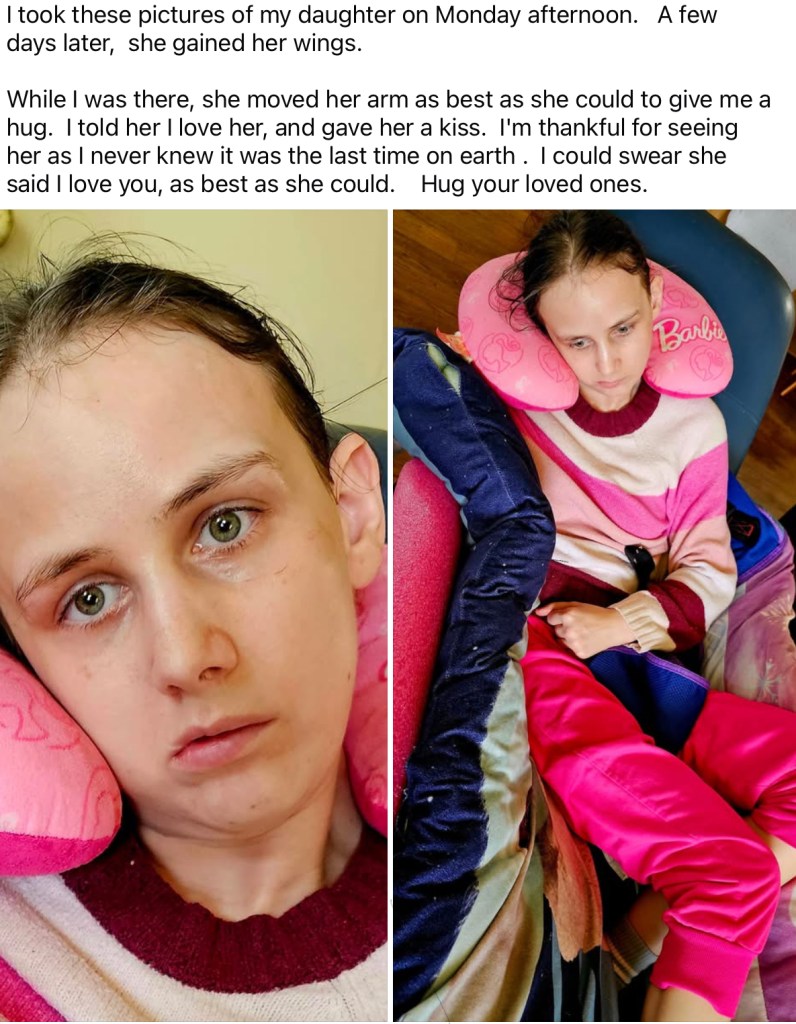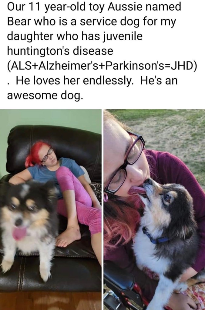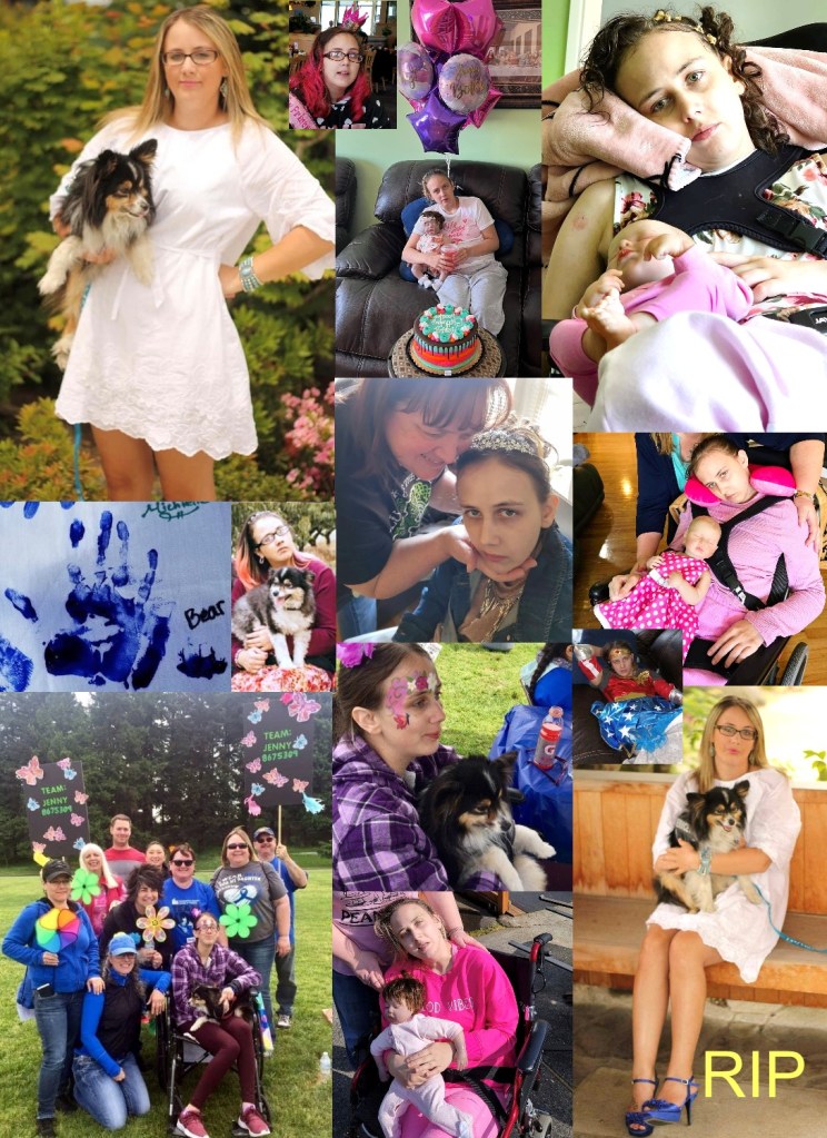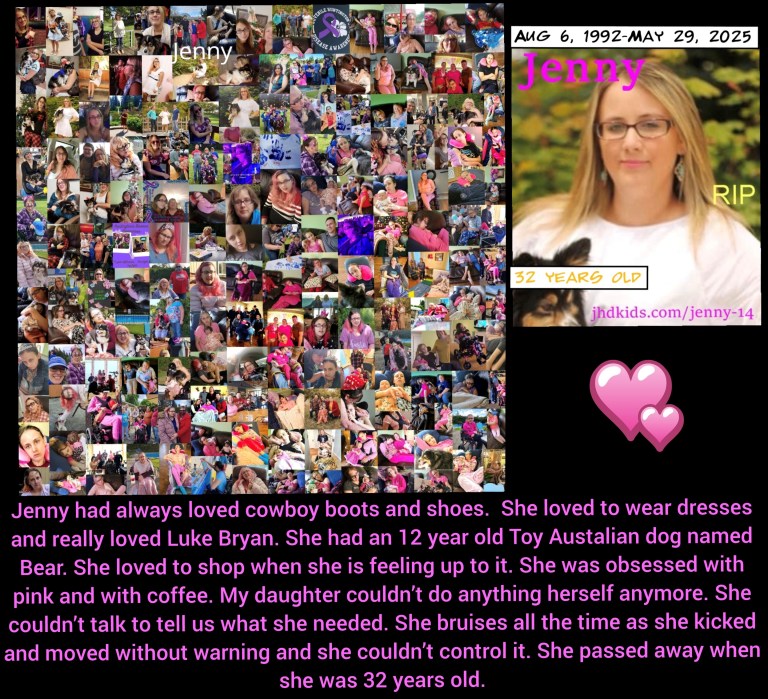 Jenny, had JHD. When she was about 16 she started developing symptoms. She struggled in school where her brother and sister excelled, one becoming a drafter and one becoming a doctor. We couldn’t understand why she had all the problems she had. She started struggling with depression and ended up in ICU from trying to end her life at the age of 18. She started falling down a lot. Her writing became harder to read. She really struggled mentally and emotionally. People thought she was drunk or on drugs but she wasn’t. We learned her dad had HD. She went to get tested but was denied to get tested because the doctor thought she was mentally unstable and needed a counselor which she refused to go to. It would be another 2 years of wondering and hoping it was something else. She ended up in the hospital again where I talked to the doctor and told him how she needs this HD test so she can be treated right. She agreed, 10 days later we found out she had it, that was 3 years ago. She had always loved cowboy boots and shoes. She was born on Aug 6, 1992-May 29, 2025. She loved to wear dresses and really loved Luke Bryan. She had an 12 year old Toy Austalian dog named Bear. She loved to shop when she is feeling up to it. She was obsessed with pink and with coffee. She was in hospice. My daughter couldn’t do anything herself anymore. She couldn’t talk to tell us what she needed. She bruises all the time as she kicked and moved without warning and she couldn’t control it.