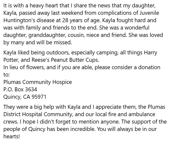 Kayla Rae was born on Feb 16, 1996-Oct 12, 2024. Her symptoms started around 17.. It Started getting harder to grab things and walk. She used a wheelchair.