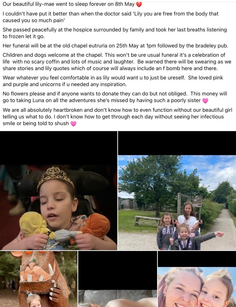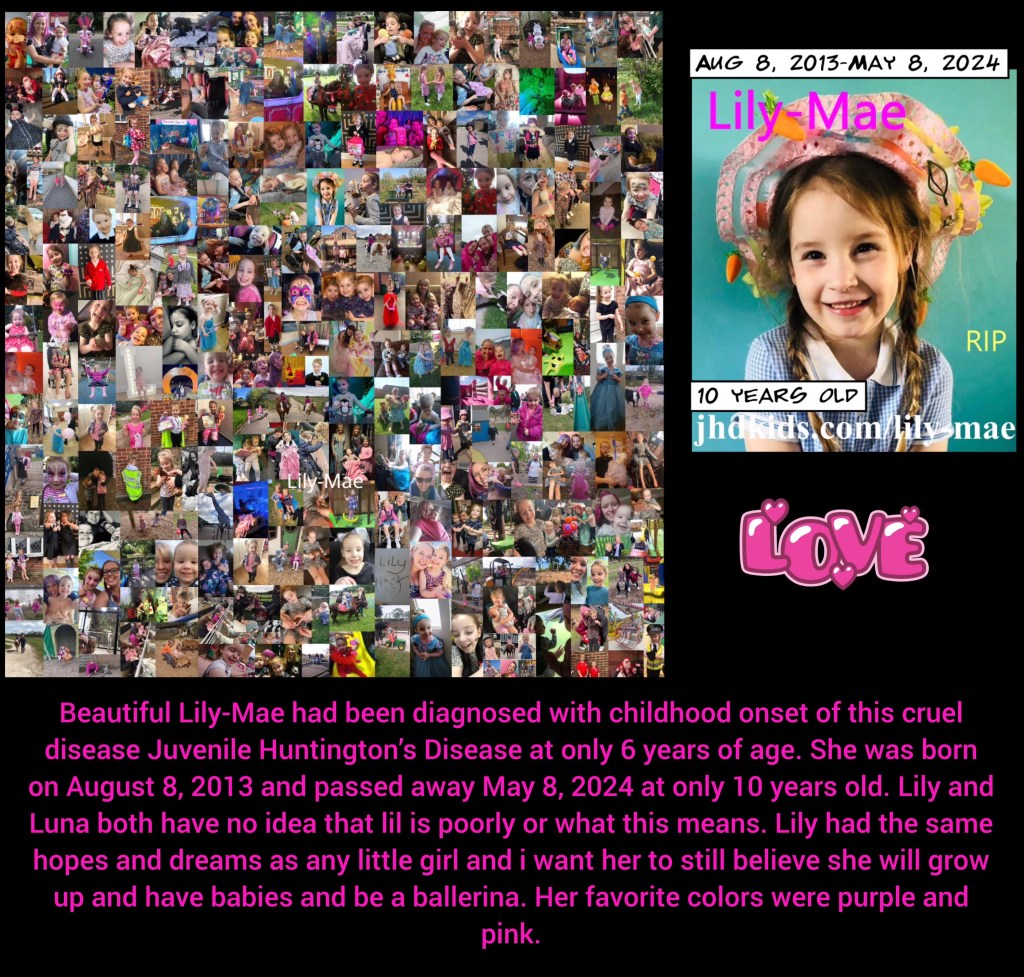 Beautiful Lily-Mae had been diagnosed with childhood onset of this cruel disease Juvenile Huntington’s Disease at only 6 years of age. She was born on August 8, 2013 and passed away May 8, 2024 at only 10 years old. Lily and Luna both have no idea that lil is poorly or what this means. So we asked you to be sensitive if you spoke to us with the children present or if u told your own children. Lily had the same hopes and dreams as any little girl and i want her to still believe she will grow up and have babies and be a ballerina. Her favorite colors were purple and pink.