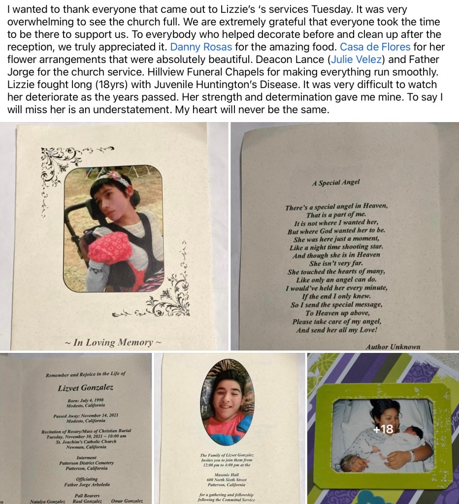 Flores for her flower arrangements that were absolutely beautiful. Deacon Lance (Julie Velez) and Father Jorge for the church service. Hillview Funeral Chapels for making everything run smoothly. Lizvet fought long (18yrs) with Juvenile Huntington’s Disease. It was very difficult to watch her deteriorate as the years passed. Her strength and determination gave me mine. To say I will miss her is an understatement. My heart will never be the same.
