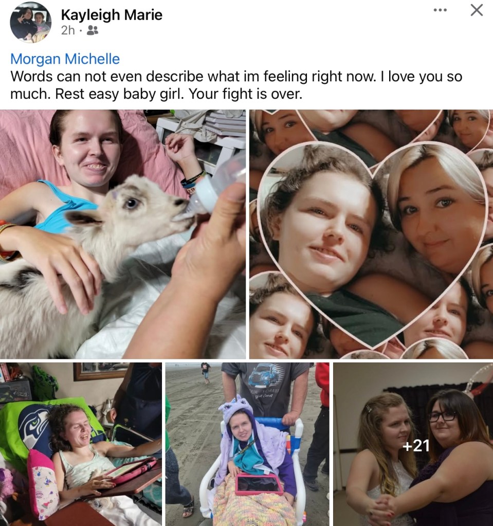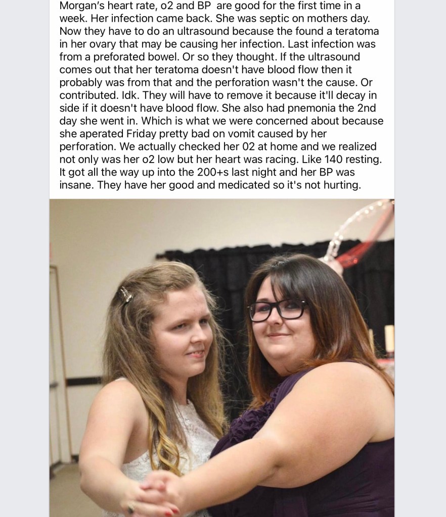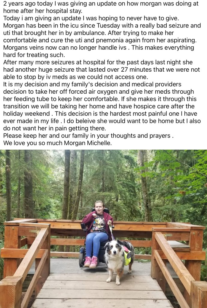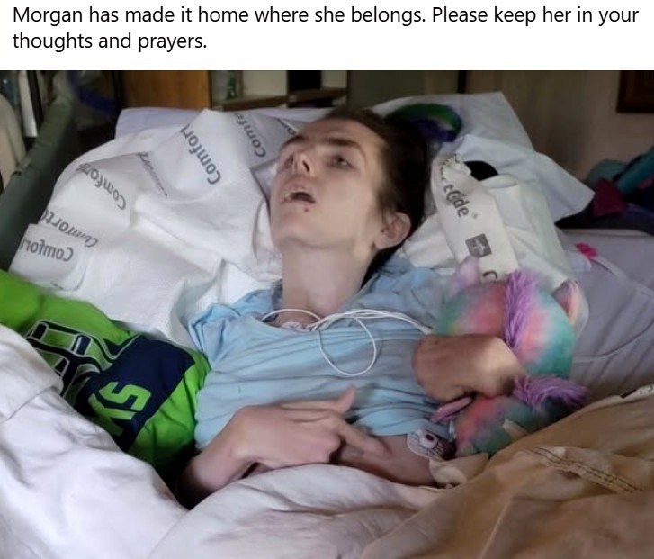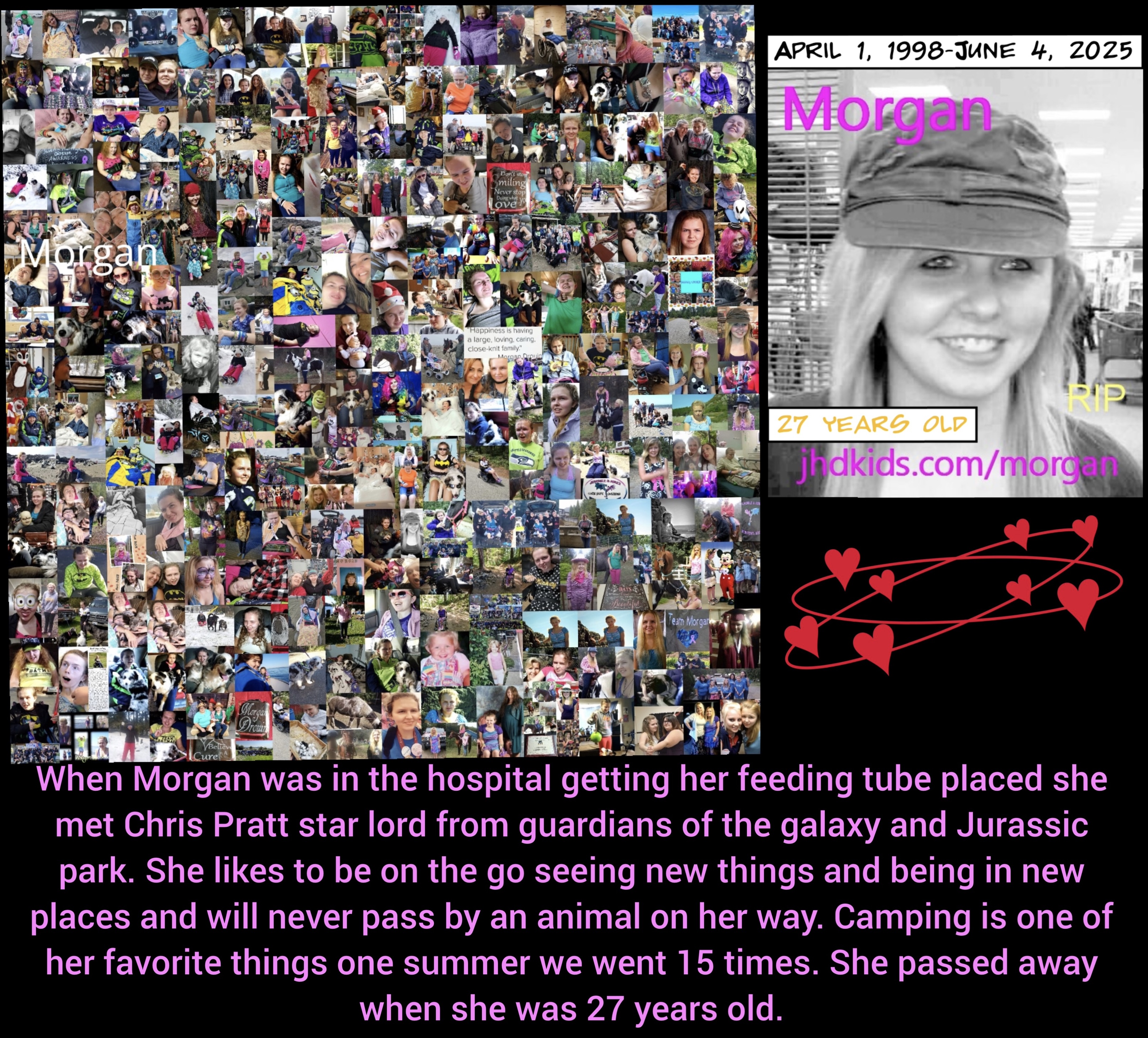 Morgan was born April 1, 1998-June 4, 2025. She had a feeding tube placed 2 1/2 years ago, but had started taking stuff by mouth some again. When she was in the hospital getting her feeding tube placed she met Chris Pratt star lord from guardians of the galaxy and Jurassic park.Â