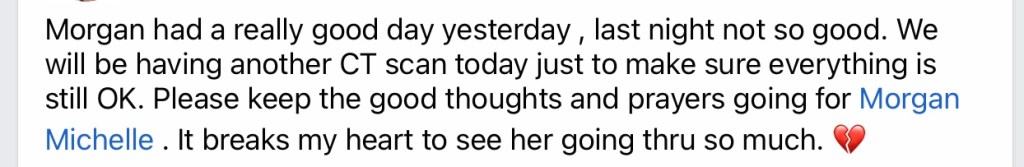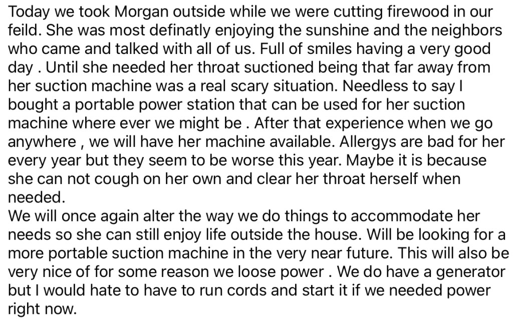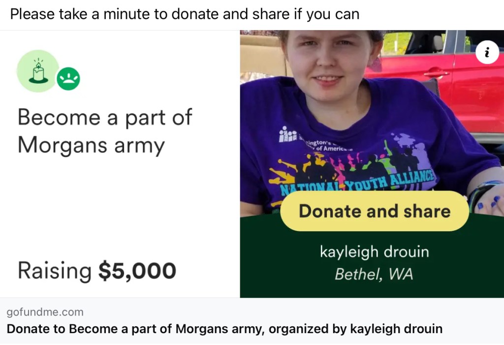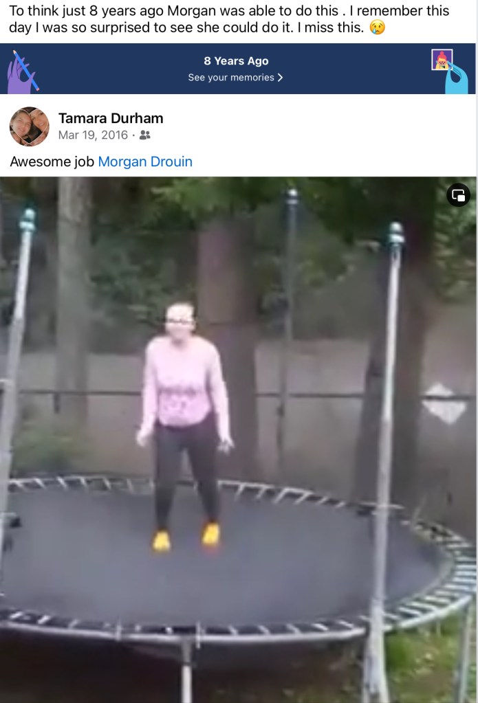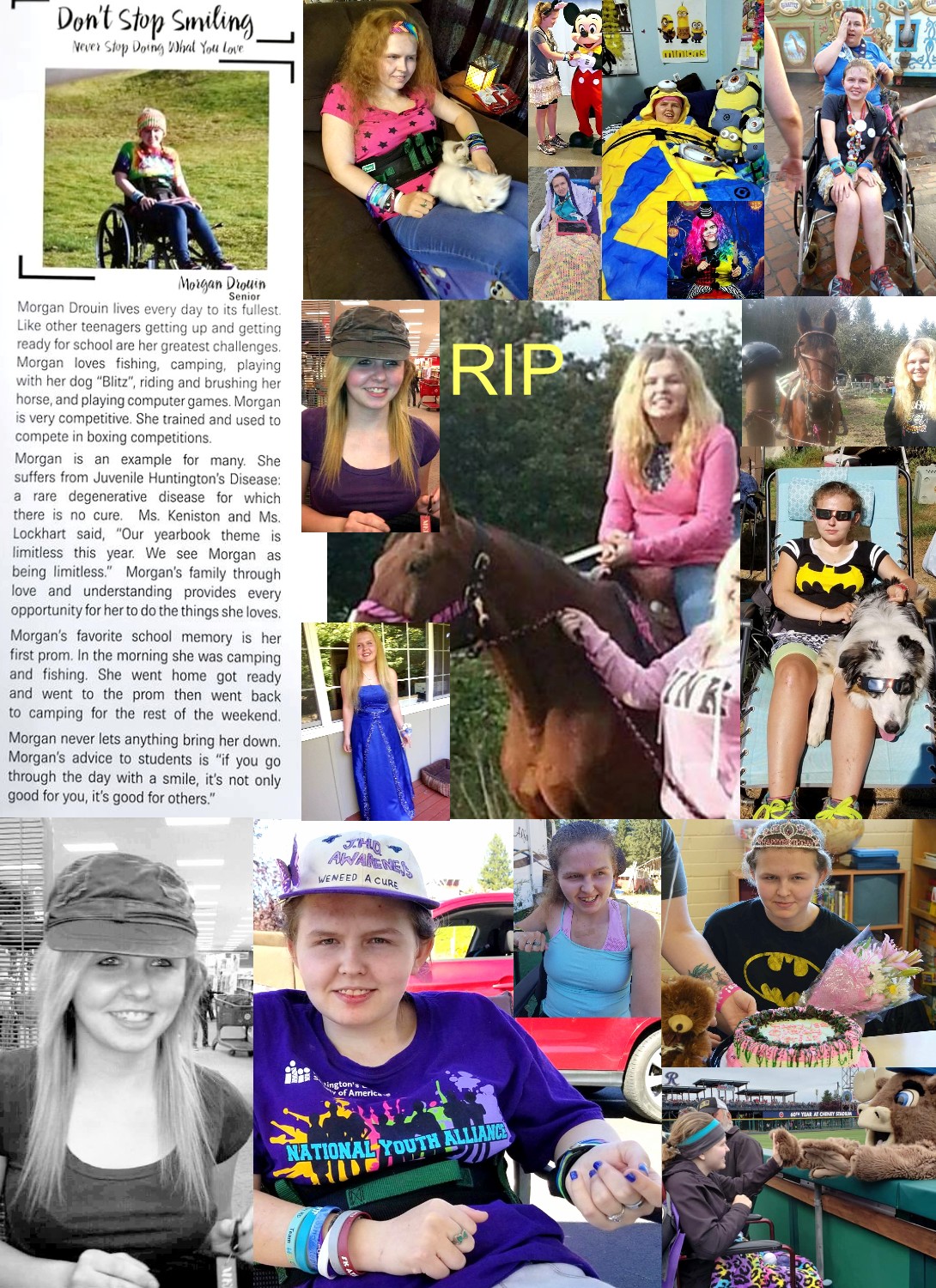 Morgan was born April 1, 1998-June 4, 2025. She had a feeding tube placed 2 1/2 years ago, but had started taking stuff by mouth some again. When she was in the hospital getting her feeding tube placed she met Chris Pratt star lord from guardians of the galaxy and Jurassic park.Â