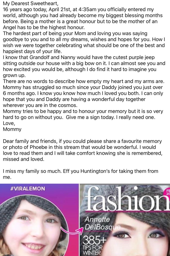 Phoebe’s life and we will never forget you for all you did for her. The care and support provided by the entire team at the IWK was exquisite. A special thank you to the nurses and doctors in PMU, MSNU and ICU. We are so very fortunate to have such an incredible facility in our province for our children. Joe, Ellen, Elaine, Stacie, Shauna, Jordon and Katherine, each of you will always have a special place in our hearts for the incredible support you have provided Phoebe, and to her Mom and Dad through what was singularly the hardest journey anyone should ever have to make with their child. Thank you to the RCMP and EMTs of Musquodoboit Harbour and to Heather, Vickie, Michelle and Brittany from continuing care and our private LPN, April. To Marcy, Susan, Michelle and all the many homecare workers at Northwood