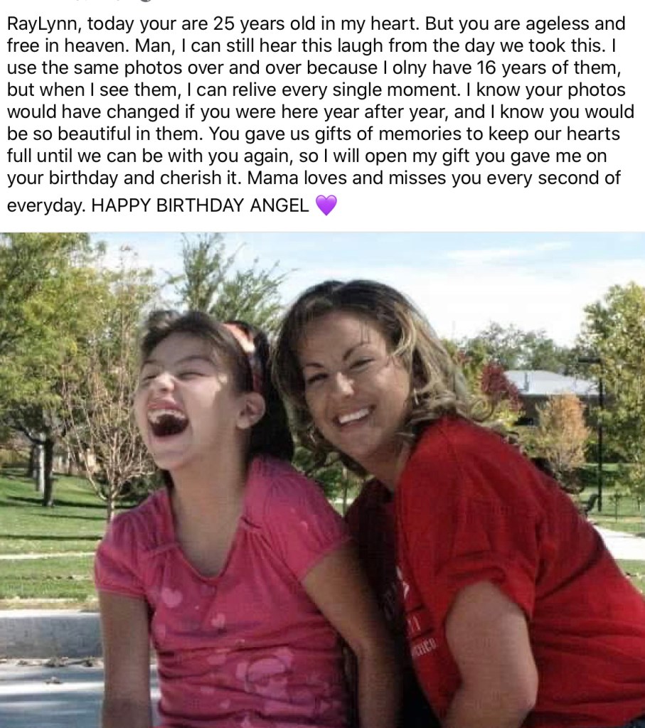 As I am combing my baby Gracie’s hair for bed, she says “Mama, I miss my sister so much it makes me sad inside… But then when I close my eyes and dream, there she is!” That comforts my heart knowing RayLynn is right by her side. Love and miss you Angel Baby! –Raylynn’s Mom