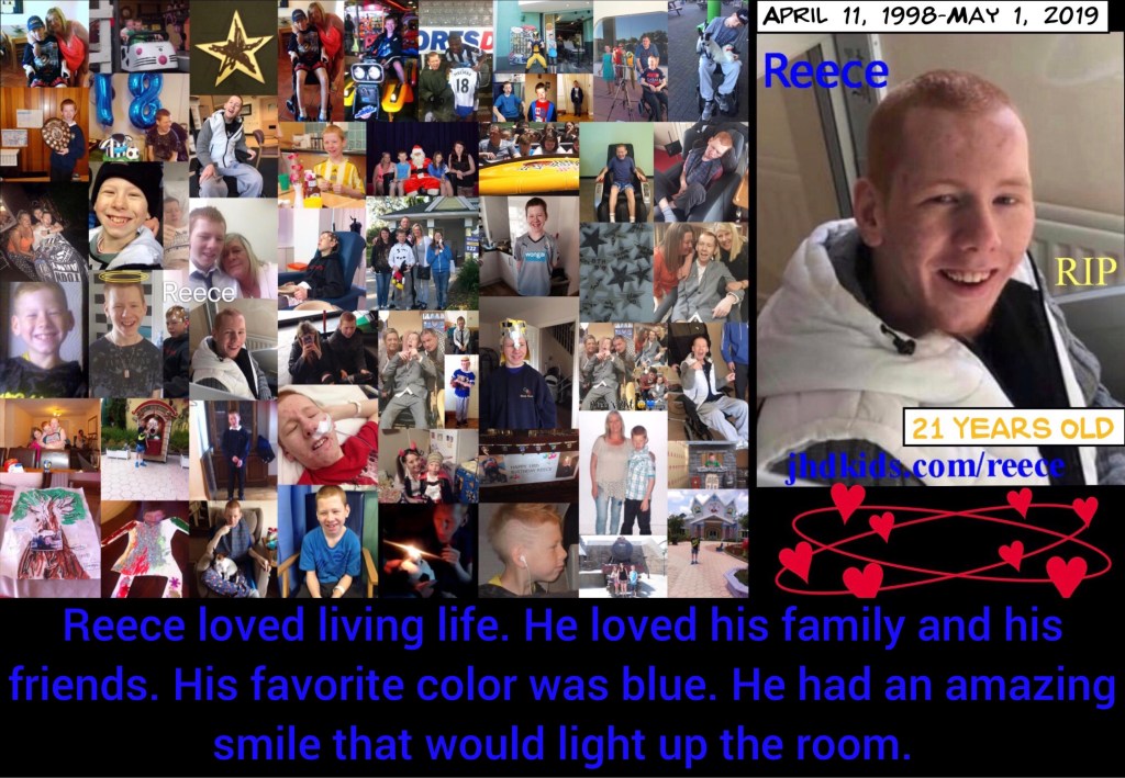 Reece loved living life. He loved his family and his friends. His favorite color was blue. He had an amazing smile that would light up the room. He fought off Juvenile Huntington’s Disease as long as possible and flew away at 21 years old. You’ll always be our Angel Reece. April 11, 1998- May 1, 2019.