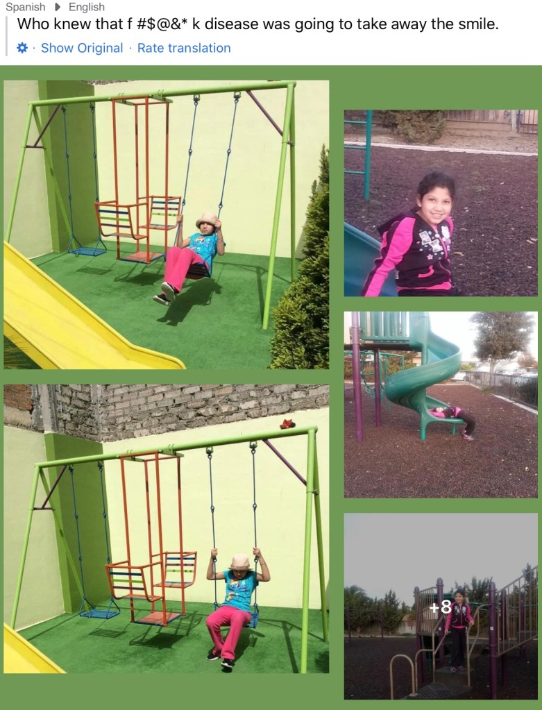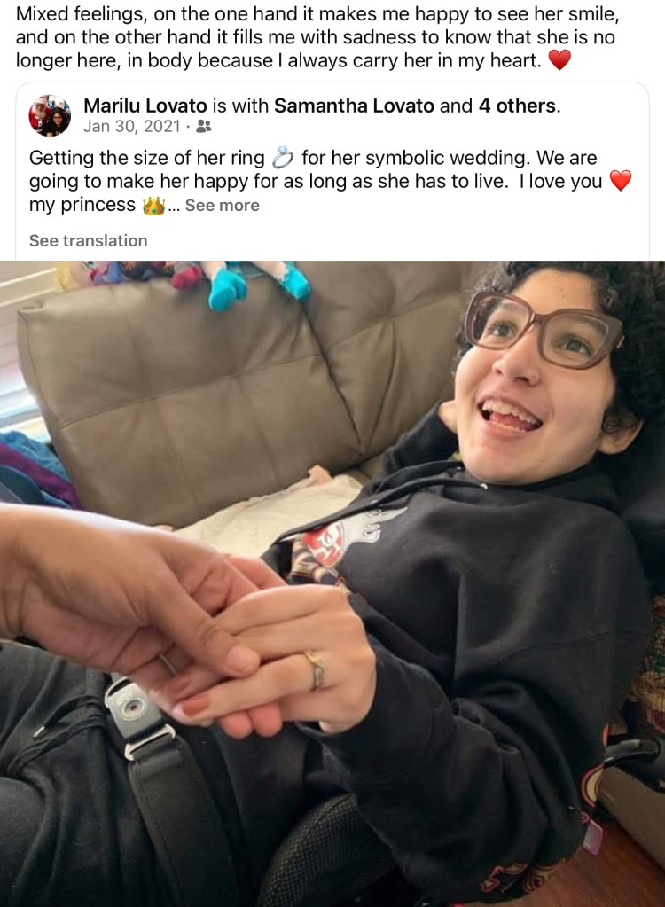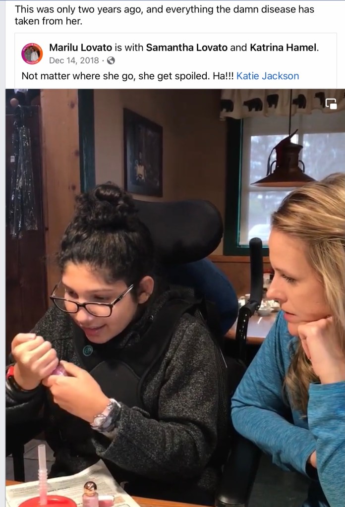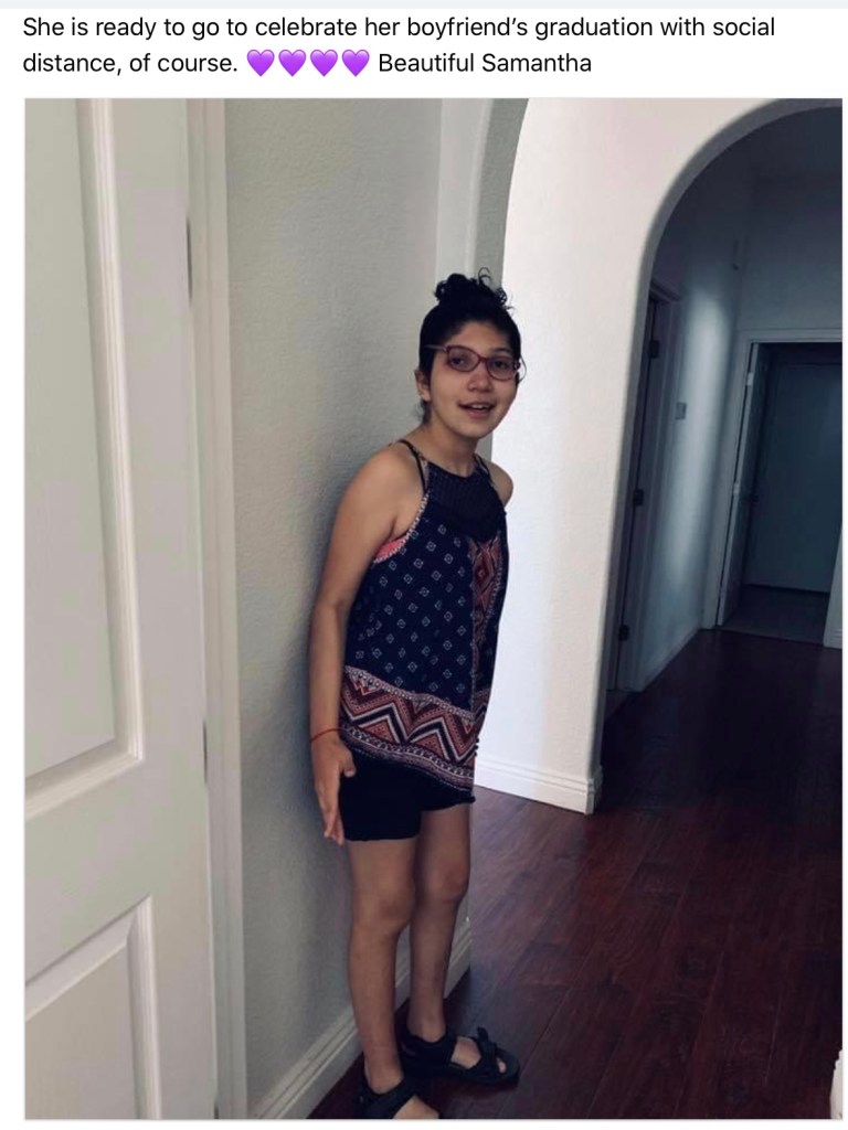 samantha (194)Samantha was born on Aug 17, 2004-March 22, 2023. She had many symptoms like seizures (controlled for now), some mental retardation, COORDINATION with the body, unexplained falls. And sometimes nightmares hallucinations, spontaneous reflux. Sam was declining to much, she couldn’t read or write anymore, she fell a lot, more aggressive, compulsive, she was loosing her speech, shocking with food or drinks. Difficult to fall asleep. She had gotten very progressed. She no longer walked, she tried to communicate but was not understood, she couldn’t use her hands, she was already incontinent, they were the hospital waiting for them to put a feeding tube, since she is was not eating and had become dehydrated. sometimes she was with us and sometimes she was in her own world.