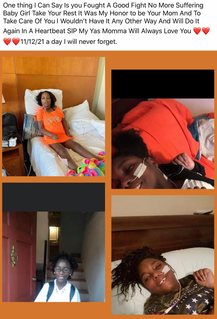 My beautiful niece Yasmine. She’s such a strong, sweet and loving girl. She has been through so much but she still from time to time let us see that beautiful smile. I remember when she was little she was so full of life she ran and played and she didn’t take no mess from no one😊 then I remember she was getting sick but she stayed as full of life as much as she could❤we thank God for how far he has brought her and we thank God for how far he’s going to take her. Auntie Felicia and Uncle Harold and Sequoia Love you very much Yasmine❤❤❤